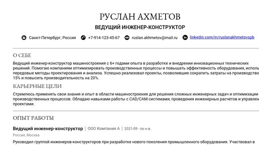 Пример резюме ведущего инженера-конструктора машиностроения 2025
