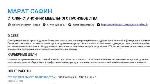 Изучите пример резюме столяра мебельного производства, чтобы узнать, как составить документ, который эффективно представит ваш опыт и навыки. Правильно составленное резюме – ваш первый и самый важный шаг к получению желаемой работы. 🔨 На этой странице собран полный гайд, который поможет вам создать по-настоящему эффективное резюме, соответствующее требованиям работодателей. Вы найдете . Этот материал будет полезен как начинающим специалистам, так и опытным столярам. Изучив пример, вы сможете создать резюме с помощью нашего конструктора резюме...