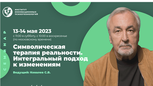 “Важно во все времена быть в гармонии с миром и вселенной и прежде всего – с самим собой“ Альфред Перле 13-14 мая 2023 г. Сергей Викторович Ковалев проведет семинар “Символическая терапия реальности. Интегральный подход к изменениям (Основы общесистемной психотерапии)” Это мероприятие для специалистов ИНП, а также – как ни странно – для всех желающих, более или менее знакомых с интегральным нейропрограммированием. Профессор Ковалев представит новый(!) подход в практической психологии и личностно-ориентированной...