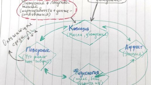 Интерпретация событий играет решающую роль. Работа с мыслями, то есть убеждениями (их я буду называть когнициями) - важнейшая часть в КПТ подходе. Представим событие: "Увольнение с работы" и разберем процесс мышления на этом примере: Событие - увольнение Эмоция - у кого-то гнев, у кого-то депрессия, у кого-то нервное, но позитивное настроение. У каждого будет своя интрепретация/ощущение (из-за разных когниций - про них позже) Мысль - "Как они могли?!" Реакция - "Плач", "Удар кулаком об стену" итд Когда эмоция избыточна - значит, интерпретация(когниция) кривая для данной ситуации...