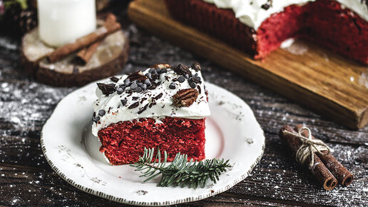 Десерт «Красный бархат» со сметанным кремом и орехами пекан