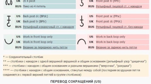 back past double crochet – BP dc – столбик с накидом провязанный снизу back past single crochet – BPSC – столбик без накида провязанный снизу back past treble crochet- BPTR – столбик с 2 накидами провязанный снизу chain – ch – воздушная петля, цепочка cluster – группа (столбиков с одной вершиной) double crochet – dc – столбик с накидом double treble crochet – dtr – столбик с тремя накидами front past single crochet – Fpsc – столбик без накида провязанный сверху front past treble crochet – Fptr –...
