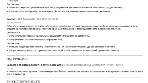 Пример резюме крупье поможет вам быстро понять, как составить документ, который привлечет внимание работодателя. Изучение готовых примеров – лучший способ создать эффективное резюме и получить приглашение на собеседование. 🎲 Независимо от того, являетесь ли вы начинающим крупье или опытным специалистом, наша статья предлагает готовые примеры и пошаговые инструкции для создания эффективного резюме, соответствующего требованиям работодателей. Вы подробно разберете каждый раздел: Изучив этот пример...