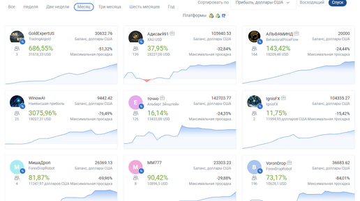 Поиск прибыльного трейдера У брокера Робофорекс есть сервис копирования сделок трейдеров. В этом сервисе есть рейтинг. Я зашел туда и начал искать прибыльного трейдера по определенным параметрам. Выбор там большой. У меня есть определенные требования к трейдеру. Например, низкая просадка и высокая прибыль для меня является ключевым показателем, а также количество дней жизни счета, или дней торговли у трейдера. таблица рейтинга трейдеров Трейдер найден Довольно таки быстро, я нашел хорошего, прибыльного трейдера...