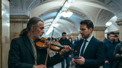 Игорь Петрович Савельев проходил через переход на «Арбатской» дважды в день уже пять лет. Утром – в офис, вечером – домой. Одинаковый маршрут, одинаковое время, одинаковые лица. И одинаковая музыка. Старик со скрипкой стоял всегда в одном месте – у поворота к синей ветке, там, где поток людей естественно замедлялся. Седые волосы до плеч, аккуратная бородка, потёртый твидовый пиджак. Футляр от скрипки открыт, внутри – мелочь и редкие купюры. Игорь никогда не останавливался. Не из жадности – просто некогда...