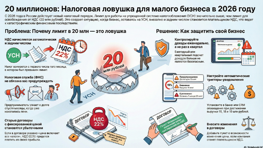 Автор: Евгений Сивков, налоговый консультант Когда в 2025 году принимали Федеральный закон от 28.11.2025 № 425-ФЗ, его называли «реформой налоговых режимов». Но реальность оказалась ближе к системному перераспределению налоговой нагрузки. Из всех нововведений самым разрушительным для малого бизнеса стал не рост НДС до 22%, не изменения по УСН и даже не новая конструкция ПСН. Настоящий раскол вызвала цифра, которую ветераны налогового права помнят ещё с начала нулевых — 20 миллионов рублей. Почему цифру 20 млн будут ненавидеть все предприниматели Эта цифра, зафиксированная в ст...