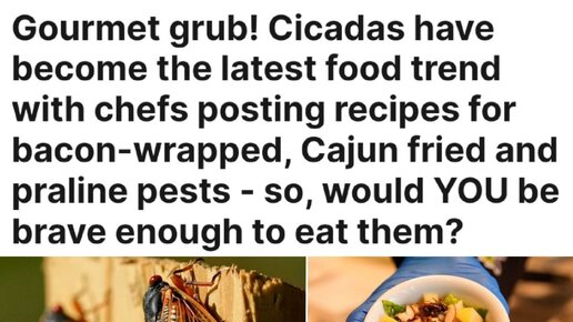 «Изысканная закуска! Цикады стали последней кулинарной тенденцией: повара публикуют рецепты завернутых в бекон, жареных по-каджунски и пралине вредителей — так хватит ли у вас смелости съесть их?»: В США по-своему справляются с нашествием миллионов цикад - их предлагают съесть. «По словам тех, кто оказался достаточно смел, чтобы попробовать их, маленькие насекомые, которые темнеют по мере взросления, содержат много белка и напоминают по вкусу орехи. И рестораны, и частные повара используют шумных...