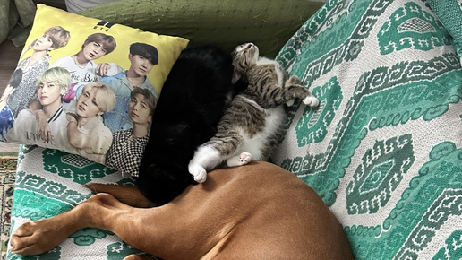 Всем добрый день! Сижу вчера, работаю, дети спят хвостатые. Арчи с кошками на диванчике, Тимоша возле мамочки своей. Вы знаете, все наши фотографии живые, настоящие, с животными, если они не дрессированные, невозможно сделать постановочное фото. Вот так спят, то есть арчи спал пришла Дуня к нему, потом и Ирина. Я попить ходила, смотрю она мостится к нему, иду обратно спят уже. Потом оглядываюсь, уже трое лежат, а кошки храпят, вы знали об этом?И не только храпят...в общем, ничто человеческое им не чуждо, перефразирую Теренция...