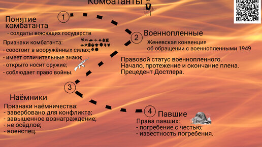 Содержание опорного сигнала: 1. Понятие комбатанта. 2. Военнопленные. 3. Наёмники. 4. Павшие. Понятие комбатанта. Лиц, находящихся в театре военных действийюридически разделили на две группы: комбатанты и некомбатанты. Комбатанты — это солдаты воюющих государств, а некомбатанты — это мирное население. Соответственно права и обязанности у данных групп в ходе военных действий разные. Например, разрешено убивать комбатантов, но строго запрещается так поступать с некомбатантами. Признаки комбатанта:...