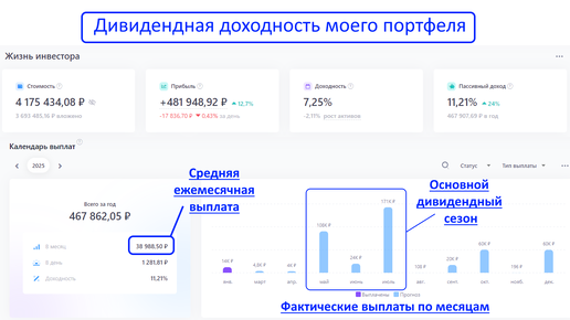 Я-дивидендный инвестор и моя цель заключается в создании пассивного источника дохода за счет дивидендов. На данный момент мой портфель приносит мне почти 39тр в месяц, но когда я называю эту сумму, я имею ввиду средние ежемесячные дивидендные выплаты за год: Т.е. если посмотреть на график выплат по моему портфелю (скрин из сервиса учёта инвестиций), то можно заметить, что в одни месяцы выплаты очень скромные и составляют всего несколько тысяч рублей, а в другие превышают сотню тысяч рублей. И практически...