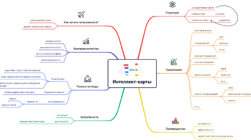Интеллект-карта - способ представления информации, основанный на ассоциативных связях. Импульс активной популяризации начал Тони Бьюзен в 70е годы 20 века. С тех пор интеллект-карты отлично себя зарекомендовали для решения широкого круга задач. В статье дается ключевая информация, позволяющая получить представление об этом инструменте. Структура В центре интеллект-карты располагается главная тема. Далее от нее отходят темы, связанные с ней. А от них - темы, связанные с уже ними, и так далее. Такая структура называется радиантной...