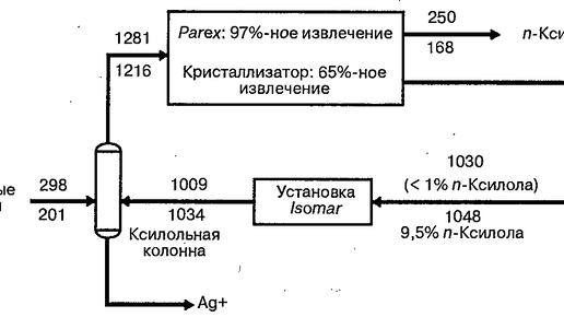 Процесс Parex компании UOP является новаторским методом адсорбционного разделения, предназначение которого - извлечение p-ксилола из суммарных ксилолов. Под суммарными ксилолами понимается смесь ароматических гомологов С8, включающая в себя этилбензол, пара-, мета- и ортоксилол. Температуры кипения этих гомологов расположены настолько близко, что разделить их посредством обычной перегонки не представляется возможным. Процесс Parex позволяет эффективно извлекать p-ксилол, с использованием твердого цеолитного адсорбента, действующего селективно по отношению к p-ксилолу...