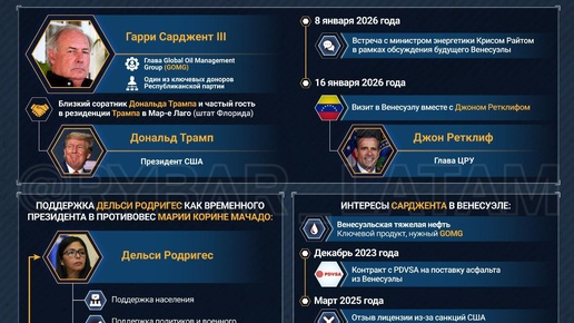 Директор ЦРУ Джон Ретклифф на днях побывал в Каракасе, где обсудил будущее Венесуэлы с новыми властями. И был он там не один. Вместе с ним в Каракас прибыл миллиардер Гарри Сарджент III, выступающий за сохранение Дельси Родригес у руля страны. 🔸Появление главы Global Oil Management Group (GOMG) демонстрирует, что к решению венесуэльского вопроса Дональд Трамп подключил своего ближайшего соратника и давнего донора Республиканской партии (и лично Трампа) в рамках его президентских кампаний. 🔻Кто...