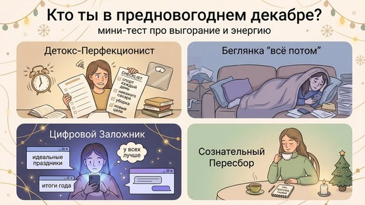Тест: кто ты в предновогоднем декабре — Детокс‑Перфекционист, Беглянка или Сознательный Пересбор?