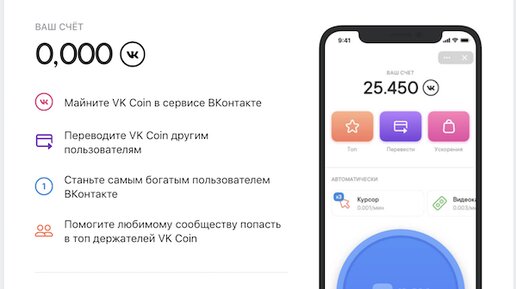 К 1 апреля была запущена игра VK Coin - майнинг внутренней валюты в ВК. Сервис позволяет заработать внутреннюю валюту, кликая по специальной кнопке. Заработанные деньги можно потратить на ускорение заработка либо перевести сообществам или пользователям. VK Coin можно загрузить через мобильное приложение Вконтакте в разделе "Сервисы". А ещё деньги можно передать другим пользователям или группам...