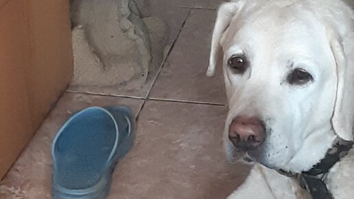 Сегодня снова пропали тапки. И бесполезно спрашивать, куда делись. Этот квест придется пройти самим. Так что всей семьей отправляемся на поиски. А кто виноват? Она! Это наша Полина — профессиональная воровка тапочек, носков, придверного коврика и всего, что "плохо лежит", точнее лежит на уровне ее носа :). Не представляю, откуда у нее такая привычка. Мы взяли ее в возрасте 1,5 лет, до этого она жила на улице в вольере. То есть научиться этому у кого-то или где-то она не могла. Как только кто-то приходит домой, она безумно радуется, хватает тапок или то, что подвернется — и несет пришедшему...