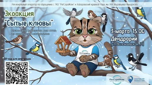 ✔ Отмечаем праздник вместе с амурским котом Дерсу и Хабаровским краевым парком им. Н. Н. Муравьёва‑Амурского ✔ Экоакция «Сытые клювы»: сделайте кормушку для птиц из природных материалов или принесите готовую (с идеей разумного потребления) ✔ Экскурсия по дендрарию — самому старому на Дальнем...