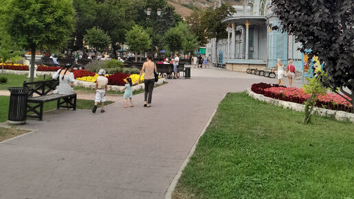 Друзья, этим летом мы ездили в КавМинВоды и большую часть отпуска провели в Пятигорске. Конечно, нашим маломобильным составом мы мало где были, но всё же расскажу про места, куда ездили. А вас, если вы знаете другие интересные места в Пятигорске, попрошу дополнить меня в комментариях. Парк "Цветник" и Лермонтовская галерея Этот парк, наверное, самое известное место в Пятигорске. Парк совершенно небольшой, но очень милый. Здесь можно встретить как туристов, так и местных. Можно сказать, жизнь тут кипит:) И художники пишут картины, и певцы песни поют, и торговцы всякой всячиной торгуют...