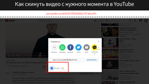 Если вам нужно скинуть видео с YouTube куда-либо с определенного момента, а не с начала, то нужно сделать следующее: За время отвечает приставка "t=442", 442 - время в секундах с которого начнется видео, можно подставить любое нужное вам значение...