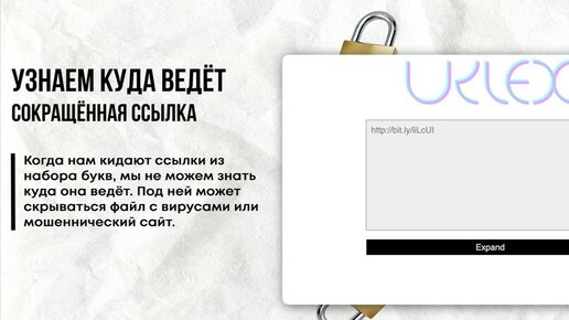 Узнаем куда ведёт сокращённая ссылка Когда нам кидают ссылки из набора букв, мы не можем знать куда она ведёт. Под ней может скрываться файл с вирусами или мошеннический сайт. Чтобы не попасться мошенникам, воспользуйтесь сервисом https://urlex...