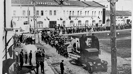1 мая 1936 года. Демонстрация на площади Революции. Снимок сделан с балкона бывших Присутственных мест. Сейчас в этом здании музыкальная школа. Если обратиться к вологодским газетам 1936 года, то узнаем, что в городе тогда были большие проблемы с обувью. Причём с любой - мужской, женской, детской. Вся она была плохого качества. Особенно вологжане жаловались на товар, приобретённый в универмаге...