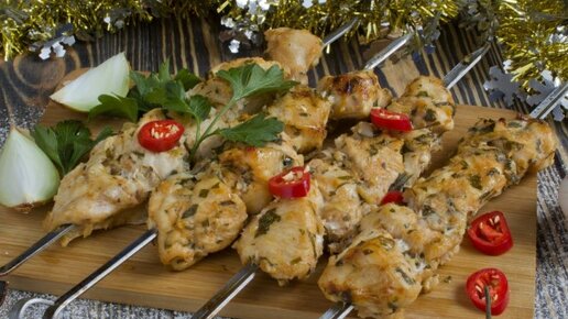 Это блюдо готовится очень просто. Кусочки куриного филе, запечённые на шпажках (или на небольших шампурах) в духовке, получаются, благодаря интересному маринаду, очень вкусными, сочными и аппетитными. Такой шашлык можно подать и в будни, и в праздники.