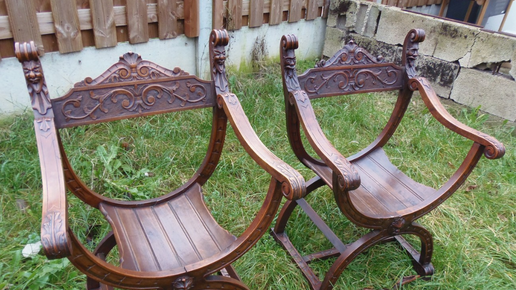 Курульное кресло - это удобное и роскошное кресло с высоким спинкой и подлокотниками. Оно имеет обычно овальную или ромбовидную форму и часто украшено резьбой, инкрустацией и драгоценными материалами, такими как мех, шелк или бархат. Курульные кресла были популярны в королевских дворцах и аристократических резиденциях в 18-19 веках. Сегодня они могут использоваться как предметы интерьера в роскошных домах или гостиницах. Стиль приведенных здесь кресел - ренессанс.