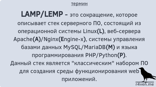 Приветствую! Сегодня в наш словарик линуксоида добавляется новый термина — LAMP или LEMP сервер. Присоединяйтесь к нашему каналу: t.me/r4ven_me и чату: t.me/r4ven_me_chat в Telegram. Если вы начинаете изучать Linux и как-либо сталкивались с «внутренностями» веб технологий, то, скорее всего, вы слышали о LAMP/LEMP-сервере. LAMP или LEMP — это аббревиатура, которая обозначает стек серверного программного обеспечения, часто используемого для настройки работы веб-сайтов и приложений...
