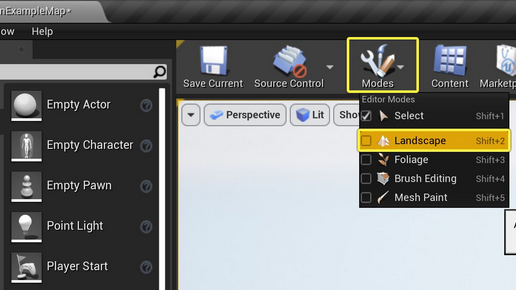 Для начала нужно в открывшемся проекте кликнуть по вкладке Modes и в выпадающем списке выбрать Landscape, либо нажать сочетание клавиш Shift+2 и вы сразу перенесетесь в инструмент ландшафта...