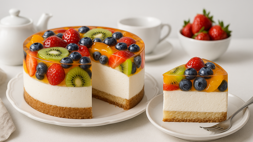Лёгкий торт с суфлейным кремом и фруктами в желе