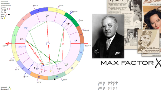 Максимилиан Факторович родился 15 сентября. Солнечная Дева. Американский бизнесмен, выходец из Российской империи. Основатель компании «Max Factor». Невероятная судьба. От Рязани до Голливуда. Если мы посмотрим день рождения на полдень, то Луна предпринимателя будет в знаке Водолея. В 15.00 она переходит в Рыбы. Когда же родился Максимилиан Факторович? Водолей знак интеллекта, коллективов, науки, неба, детских домов. Рыбы знак *оторванности* от места обитания. Это чужак в стране, мигрант. Рыбы про потери и печаль...