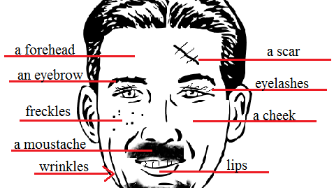 Сначала перечислим слова, которыми обозначаются основные черты лица. face [feɪs] - лицо She has a pretty face. - У нее красивое лицо. eye [aɪ] - глаз (множественное число - eyes) eyebrow ['aɪbrau] — бровь (множественное число - eyebrows) eyelash ['aɪlæʃ] — ресница (множественное число - eyelashes) eyelid ['aɪlɪd] — веко (множественное число - eyelids) nose [nəʊz] — нос mouth [mauθ] — рот lip [lɪp] — губа (множественное число - lips) cheek [ʧiːk] — щека chin [ʧɪn] — подбородок...