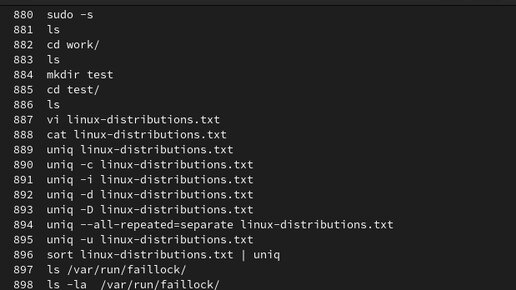 Команда history в Linux отображает список ранее выполненных команд в табличном формате; при этом в первом столбце отображается номер команды, а во втором столбце — выполненные команды. Доступ к списку ранее набранных команд также можно получить, нажав клавиши со стрелками «Вверх» и «Вниз» на клавиатуре, что помогает избавиться от повторного ввода недавно выполненной команды. Количество сохраненных предыдущих команд настраивается и это значение по умолчанию, различно в зависимости от дистрибутива...