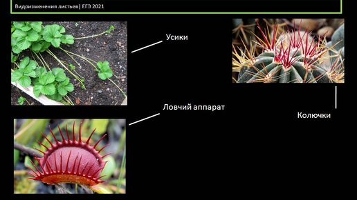 Листья растений могут принимать самую различную форму. Видоизменения листьев растениям необходимы для определённых условий среды. Видоизменения растений помогают растениям приспособиться к определённой среде обитания. Среди основных видоизменений органов растений выделяют: -Листья колючки Видоизменённые листья, выполняющие функцию защиты растения. Пример: Листья колючки кактуса -Ловчий аппарат Ловчий аппарат - видоизменение, которое необходимо для ловли насекомых. Из данного факта не вытекает факт того, что растения питаются готовыми органическими веществами, то есть являются гетеротрофами...