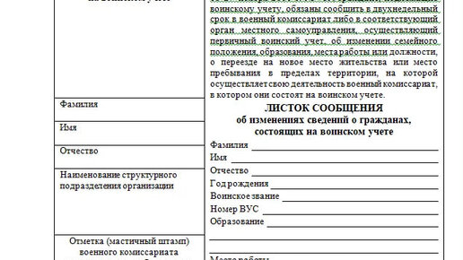🤝Общаясь и обучая коллег, часто слышу фразу: - Каша в голове с этим воинским учетом🤬! - Слона можно съесть по-кусочкам, - обычно отвечаю с улыбкой. Листок сообщения об изменениях выдается работникам при изменениях: - семейного положения; - образования; - структурного подразделения организации; - должности; - места жительства или места пребывания; - состояния здоровья граждан, состоящих на воинском учете. Для чего? Для того, чтобы этот работник сходил в военный комиссариат, где ему внесут изменения в его ВБ и его документы, которые хранятся в ВК...