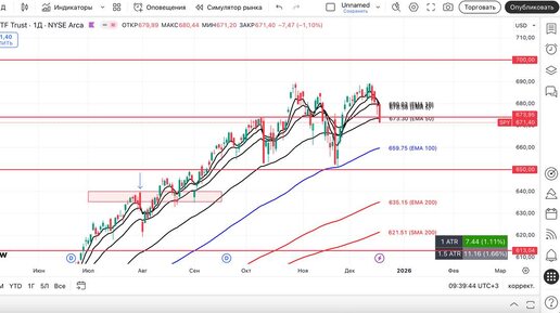 данный момент пробивает сильной «медвежьей» свечой. Учитывая, что $QQQ и $SMH зависли в воздухе = не исключаю более глубокого пулбэка вплоть до 20 EMA W. Сценарий, который я описывал 23 ноября, предусматривающий повторное тестирование 20 EMA W, сейчас выглядит очень вероятным...
