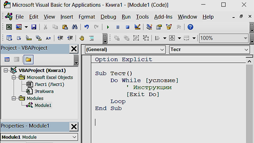 Один из типов циклов, который мы рассмотрим, - это циклы Do While и Do Until. Они позволяют выполнять определенный блок кода до тех пор, пока заданное условие выполняется. Цикл Do While Цикл Do While выполняется, пока заданное условие истинно. Вот два варианта синтаксиса: 1. С условием в начале: Do While [условие] ' Инструкции [Exit Do] Loop 2. С условием в конце: Do ' Инструкции [Exit Do] ' Дополнительные инструкции Loop While [условие] Разница между ними заключается в моменте проверки условия:...