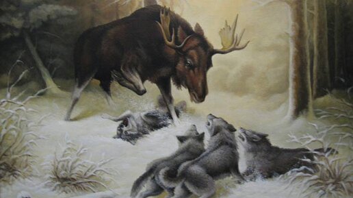 Однажды холодной и снежной зимой пришли в наш лес чужие волки… А здешний лось был уже старый, и в ту зиму ему особенно тяжело было – снег глубокий, ходить по нему трудно даже на таких длинных ногах как у лося… Вот и голодал он, подолгу лежал где-нибудь в низинке – снегом его по самые уши заметёт – вроде и тепло. Да ведь лось – не медведь, всю зиму лежать не может. Полежит да и встаёт, отряхивает с себя снег, с трудом пробирается к кустам вдоль речки, ест ветки… Один куст объест, к другому по снегу,...