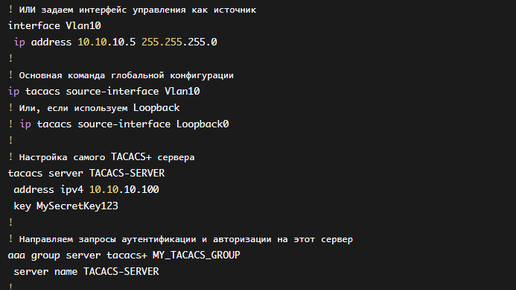 Команда ip tacacs source-interface задает исходный интерфейс (и его IP-адрес), с которого будут отправляться все исходящие пакеты TACACS+ с сетевого устройства (коммутатора, маршрутизатора). Это нужно для двух основных целей: Допустим, у вас есть коммутатор, и вы хотите, чтобы весь TACACS+ трафик исходил из VLAN управления (Management VLAN), интерфейс которого Vlan10 имеет адрес 10.10.10.5. Что происходит:
