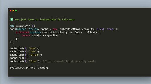 Можно реализовать LRU (Least Recently Used) cache буквально в пару строк с помощью LinkedHashMap. Главная идея: — используем порядок доступа (accessOrder = true) — переопределяем removeEldestEntry Пример: int capacity = 3; Map<Integer, String> cache = new LinkedHashMap<>(capacity, 0.75f, true) { protected boolean removeEldestEntry(Map.Entry eldest) { return size() > capacity; } }; cache...