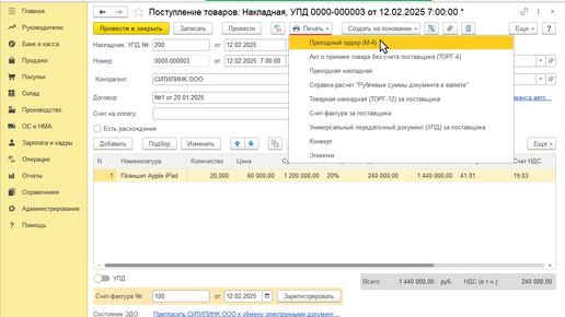 Операции по поступлению в организацию материалов от поставщиков в программе "1С:Бухгалтерия 8" регистрируются с помощью документа "Поступление (акт, накладная, УПД)" (рис. 1). Приходный ордер по форме М-4 можно распечатать из этого же документа. Поступление материалов может быть также зарегистрировано документами "Авансовый отчет", "Поступление в переработку", "Поступление из переработки", которые также позволяют вывести на печать приходный ордер по форме М-4. Поставьте, пожалуйста, лайк, если статья понравилась и была полезной, чтобы другие тоже смогли её увидеть...