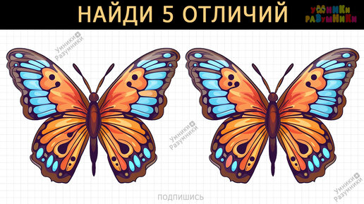 Выпуск № 48 Приветствуем всех гостей и подписчиков нашего Дзен канала Умники Разумники. В первую очередь желаем всем отличного настроения. Для Вас мы подготовили несколько заданий. Предлагаем немного отвлечься от забот и выполнить несколько заданий для разминки ума, проверить свою внимательность. Варианты своих ответов пишите в комментарии 🙂 Не будем медлить, давайте же скорее приступим... 1. В задании номер один перед Вами картинка на которой две вроде бы идентичные бабочки. Вам предстоит найти 5 отличий между ними...