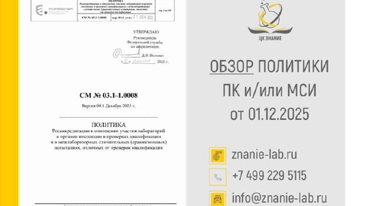 Новая редакция Политики ПК и/или МСИ. СМ № 03.1-1.0008 от 01.12.2025 (Версия 04.1 Декабрь 2025 г.). Переводим формулировки: ⚡️ПК – это МСИ с аккредитованными провайдерами, в том числе зарубежными. ⚡️МСИ, отличные от ПК – МСИ, организованные не для целей ПК (в соответствии с ISO/IEC 17043:2023 Введение, пп. «h», «i», «j»): 🔸оценка рабочих характеристик метода измерения или испытания, например, совместные испытания для целей аттестации методики; 🔸приписывание значений стандартным образцам; 🔸ключевые и дополнительные сличения, проводимые метрологическими и иными уполномоченными институтами...