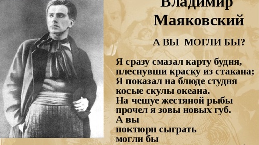 Владимир Маяковский - поэт, который в своём творчестве показал новую форму поэзии. Это связано с тем, что в раннем творчестве Маяковского отражается такое художественное направление как футуризм - поиск новых форм в поэзии, которые соответствовали ускоряющемуся темпу, ритму современной жизни. Ему близка мечта о новом светлом будущем человечества. Он искал язык, который был бы понятен народу. В стихотворении "А вы могли бы?" поэт описывает красоту города, используя метафоры, основанные на необычных и неожиданных для читателя ассоциациях, которые сближают далёкие друг от друга понятия...