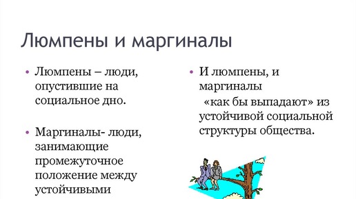 В советской школе слово "люмпен-пролетариат" встречалось детям на уроках истории в процессе изучения теории марксизма. Сейчас со словами "люмпен" и "маргинал" учащиеся знакомятся на уроках обществознания только при углубленном изучении предмета. Многие толковые словари характеризуют эти слова одинаково. Так чем отличаются "люмпены" от "маргиналов" Как Вы видите из сравнительной таблицы (см. рис. 1) эти понятия не идентичны. Почему их часто используют как синонимы и путают значение? Потому, что...