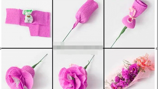 КАК СДЕЛАТЬ ВОТ такие Сладкие БУКЕТЫ Букет из конфет – это необычайно приятный знак внимания, который порадует не только замечательным внешним видом, но и вкусным содержимым. Вы можете заказать шикарную сладкую композицию или же сделать ее самостоятельно, если располагаете свободным временем – в свит-дизайне нет ничего сложного. 1. Нарежьте по 2 заготовки 7 на 3 см для 7 бутонов. Сверху на прямоугольник уложите конфетку, сверните и по нижнему краю закрепите при помощи клея. 2. Замотайте бутон вторым прямоугольником и завяжите посредине ленточкой...
