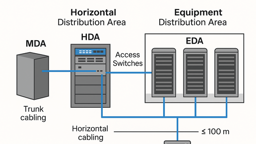 Строите отказоустойчивый дата-центр или просто хотите понять, как устроена его внутренняя “проводка”? В этой статье рассказываю, как зоны СКС в ЦОД взаимодействуют между собой и почему от правильной архитектуры зависит надёжность всей ИТ-инфраструктуры. Всё по стандарту TIA-942, но простым языком — от провайдера до серверной стойки. Структурированная кабельная система (СКС) в центре обработки данных (ЦОД) строится по иерархической схеме, разделённой на несколько функциональных зон. Стандарт TIA-942 описывает эти зоны (помещения) внутри инфраструктуры ЦОД...