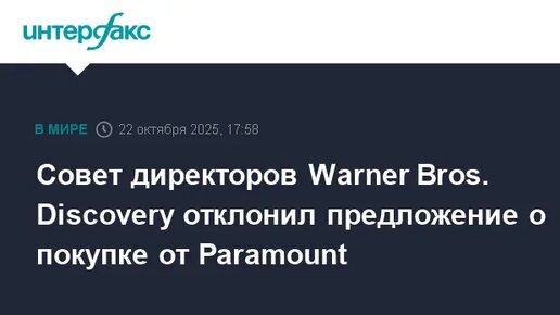 Совет директоров одной из крупнейших медиа-компаний мира — Warner Bros. Discovery (WBD) — принял решение отклонить предложенную сделку по приобретению, инициированную Paramount вместе с компанией Skydance. Информация о таком важном корпоративном шаге появилась 22 октября из источников, близких к процессу переговоров. Предложение от Paramount и Skydance стало уже третьей попыткой заключить соглашение по покупке Warner Bros. Discovery. По неофициальным сведениям, рейтинг одной акции был обозначен чуть...