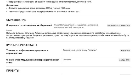 Пример резюме медицинского представителя по работе с аптеками 2025