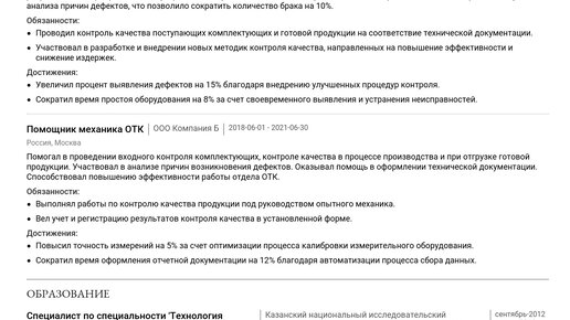 Пример резюме механика ОТК — ваш надежный ориентир в создании документа, который выделит вас среди других кандидатов. Изучение готовых, эффективных примеров поможет быстро освоить структуру и содержание идеального резюме для получения работы. На этой странице собрано все необходимое, чтобы вы могли успешно составить резюме механика ОТК, независимо от вашего опыта. Здесь вы найдете: Изучив этот материал, вы сможете легко создать сильное резюме с помощью нашего конструктора резюме. Заголовок вашего резюме – это первое, что видит работодатель...